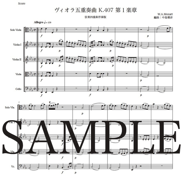 モーツァルト「ヴィオラ五重奏曲K.407第1楽章」弦楽四重奏伴奏版 コンビニプリント対応