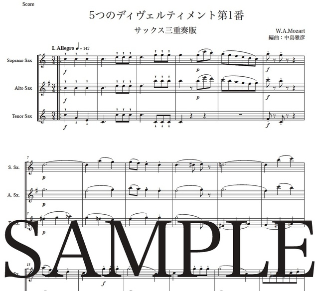 モーツァルト「5つのディヴェルティメント第1番」サックス三重奏版 コンビニプリント対応