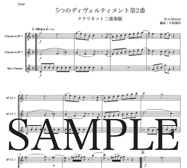 モーツァルト「5つのディヴェルティメント第2番」クラリネット三重奏版 コンビニプリント対応