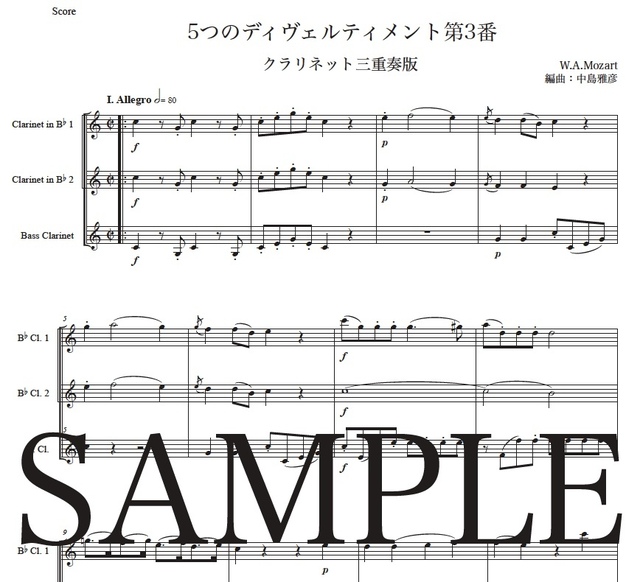 モーツァルト「5つのディヴェルティメント第3番」クラリネット三重奏版 コンビニプリント対応