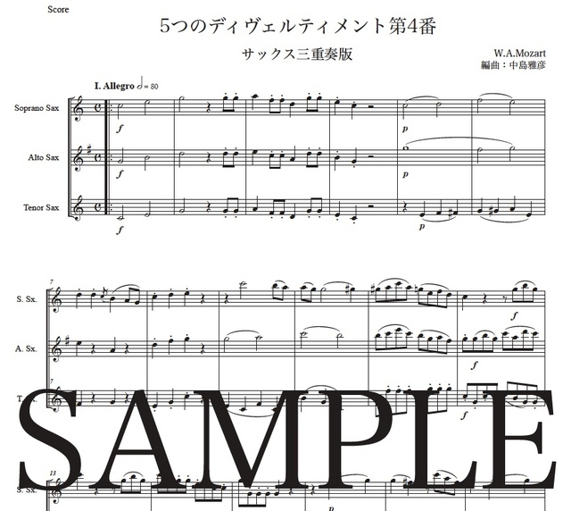 モーツァルト「5つのディヴェルティメント第4番」サックス三重奏版 コンビニプリント対応