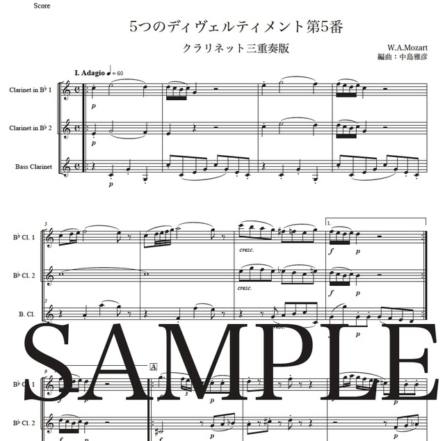 モーツァルト「5つのディヴェルティメント第5番」クラリネット三重奏版 コンビニプリント対応
