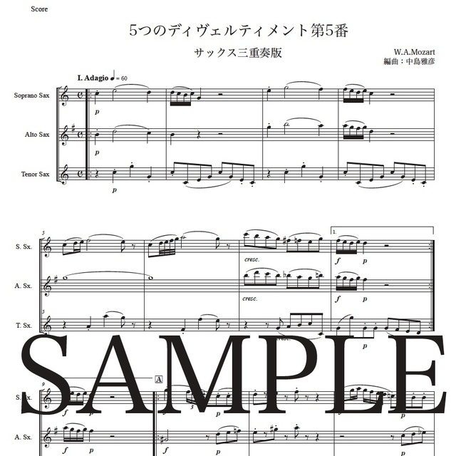 モーツァルト「5つのディヴェルティメント第5番」サックス三重奏版 コンビニプリント対応