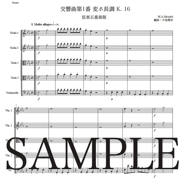 モーツァルト「交響曲第1番 変ホ長調」弦楽五重奏版 コンビニプリント対応