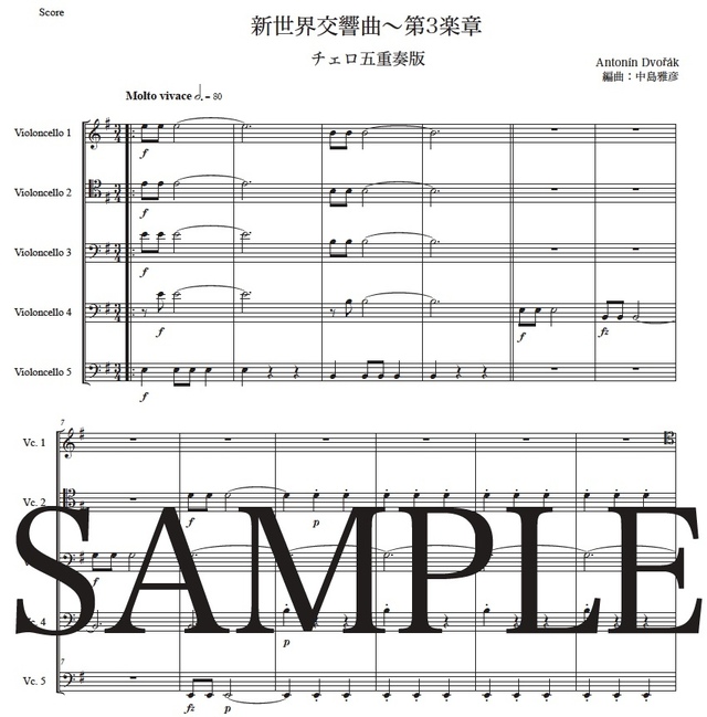 ドヴォルザーク「新世界交響曲~第3楽章」チェロ五重奏版 コンビニプリント対応
