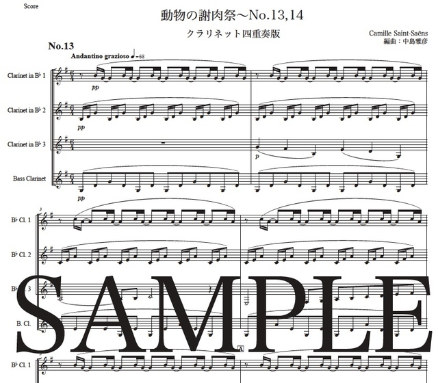 サン=サーンス「動物の謝肉祭~No.13,14」クラリネット四重奏版 コンビニプリント対応