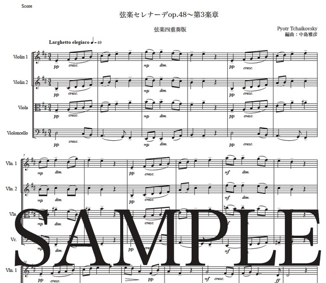 チャイコフスキー「弦楽セレナーデop48~第3楽章」弦楽四重奏版 コンビニプリント対応
