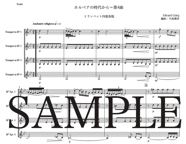 グリーグ「ホルベアの時代から~第4曲」トランペット四重奏版 コンビニプリント対応