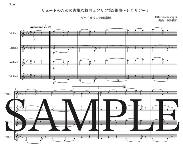 レスピーギ「リュートのための古風な舞曲とアリア第3組曲~シチリアーナ」ヴァイオリン四重奏版 コンビニプリント対応